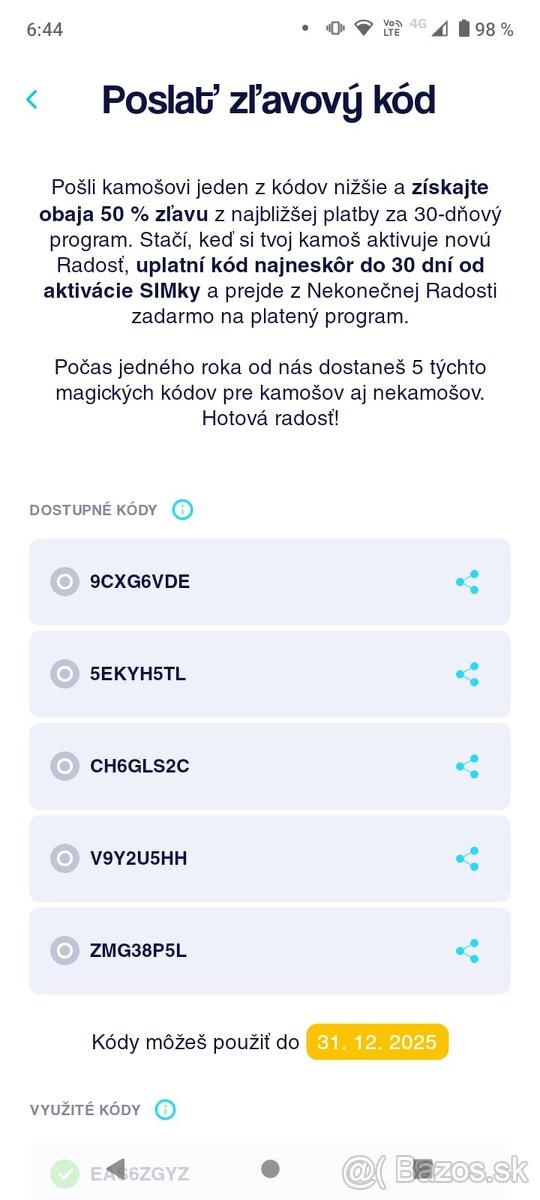 Radosť kódy na 50% zľavu na program - [19.12. 2025]Mam pre teba 50 % zlavu z platby za Radost! (kód treba uplatniť do 30 dní od aktivácie SIM karty)Uplatnene kody mazem cize vsetky su platne.