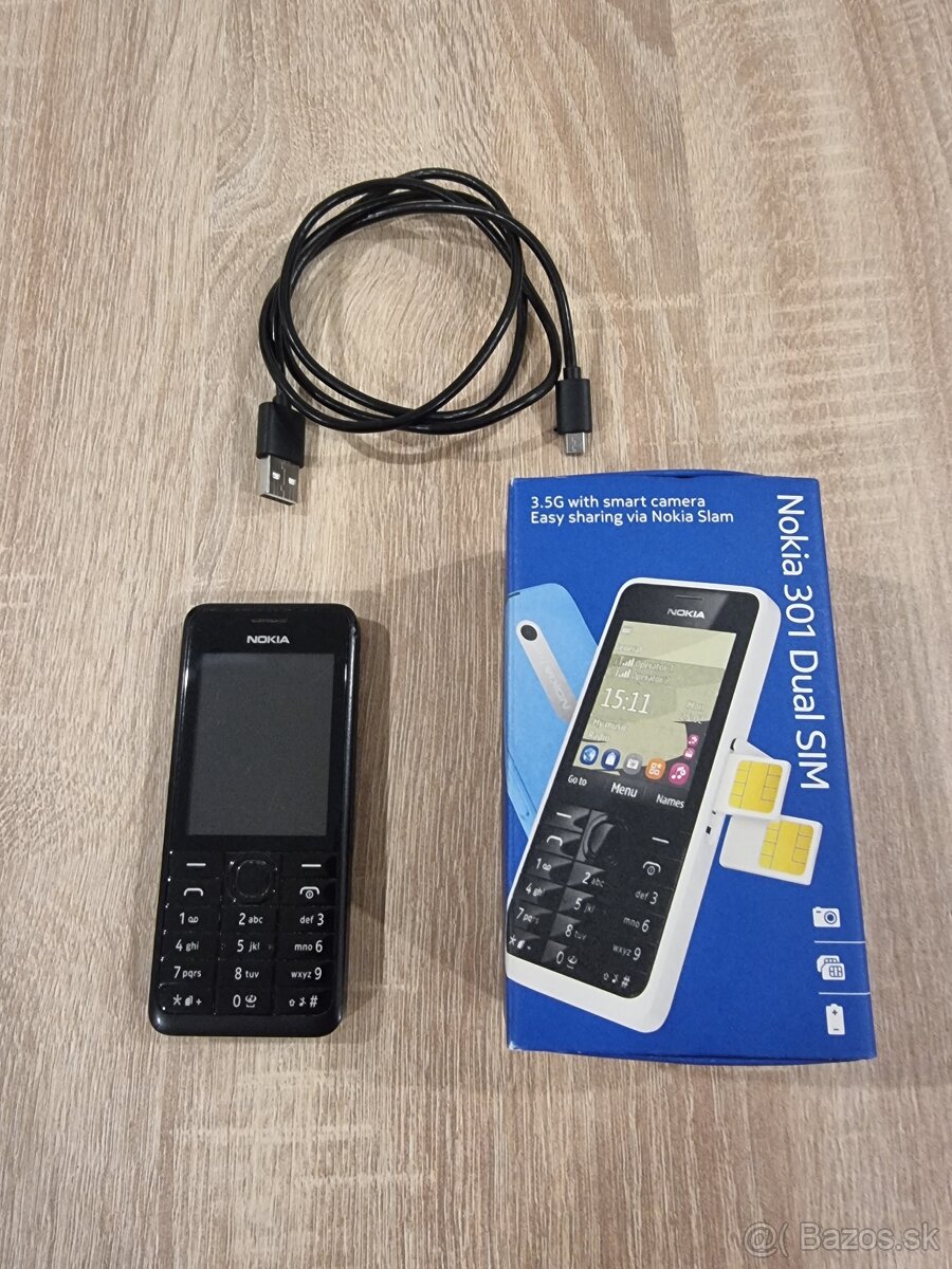 Predám mobilný telefón zn. Nokia 301, čiernej farby, plne funkčný, s originál krabicou a s nabíjacím káblom. Na mobilnom telefóne sú drobné odreninky od bežného používania. Je ľahký, má jednoduché ovládanie - vhodný aj pre staršiu osobu alebo školáka. Mobilný telefón je vyčistený a vyresetovaný na výrobné nastavenia.