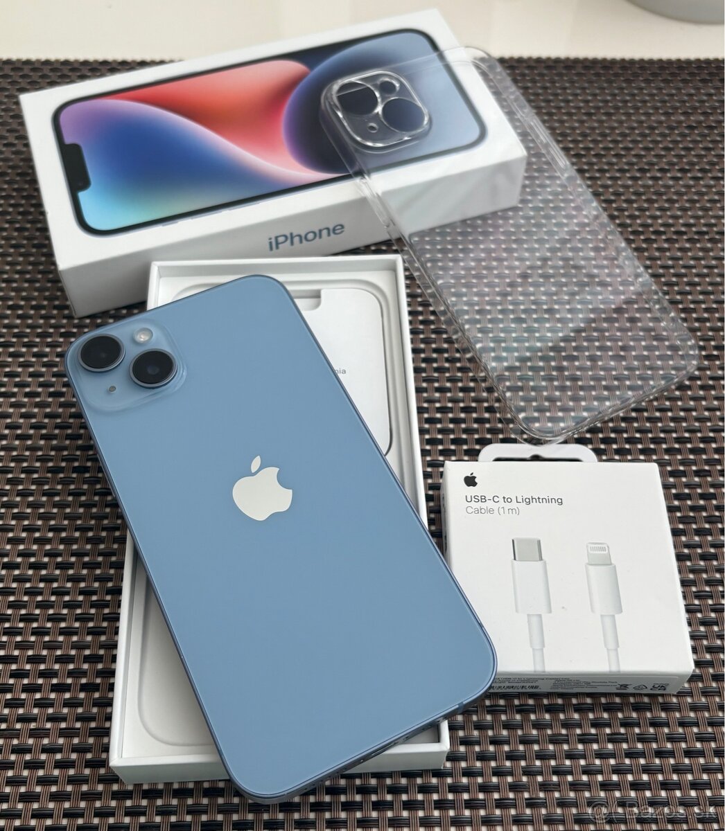 Mam na predaj iPhone 14 Plus 128GB vo farbe Blue. Mobil je v zachovalom stave, bezne znamky pouzivania. Vsetko funkcne, aj Face ID. Na mobile nebolo nikdy nic menene a ma povodny stav. Zdravie baterie 84%. Kompletne prislusenstvo- krabica, novy kabel, novy obal
