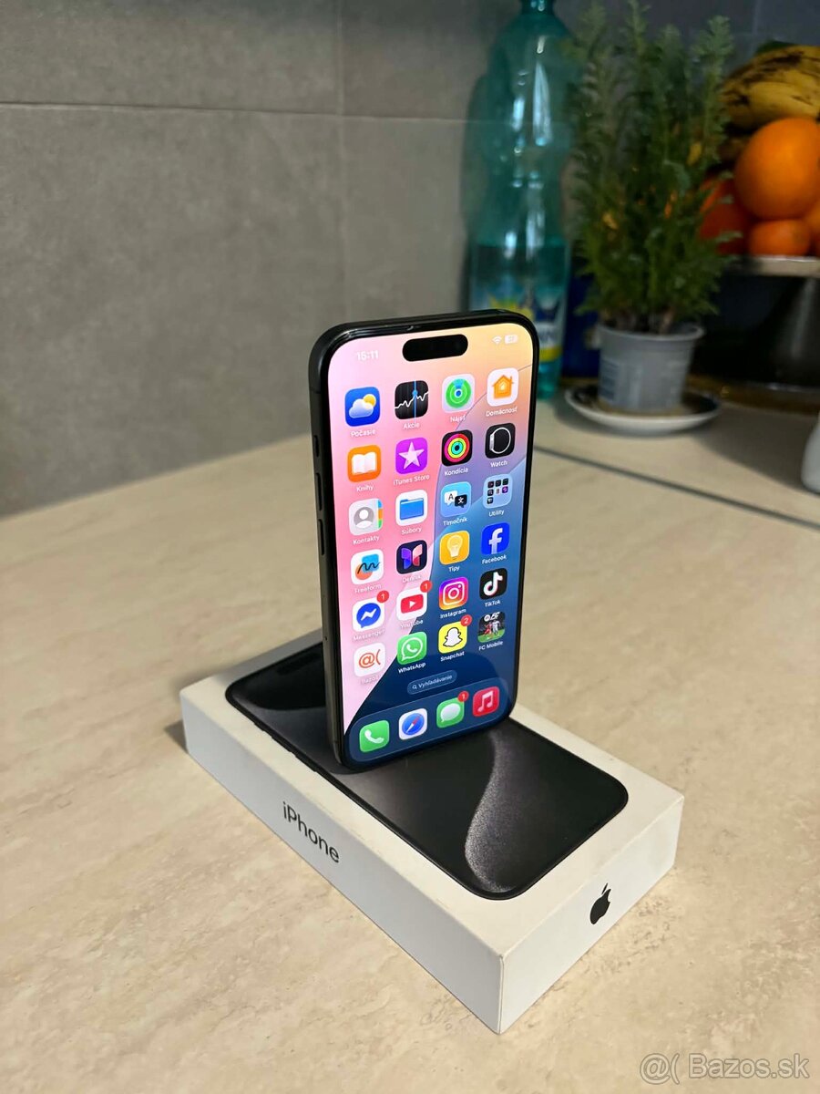Predám Iphone 15 Pro 128GB Black Titanium zdravie batéria 84% je ako nový bez škrabancov na displeji nalepené ochranné sklo nič menené nebolo FACE ID funguje všetko funguje predáva sa z krabicou cena 570€ dohoda možná len osobný odber Šaľa možná výmena za iný Iphone + - doplatky