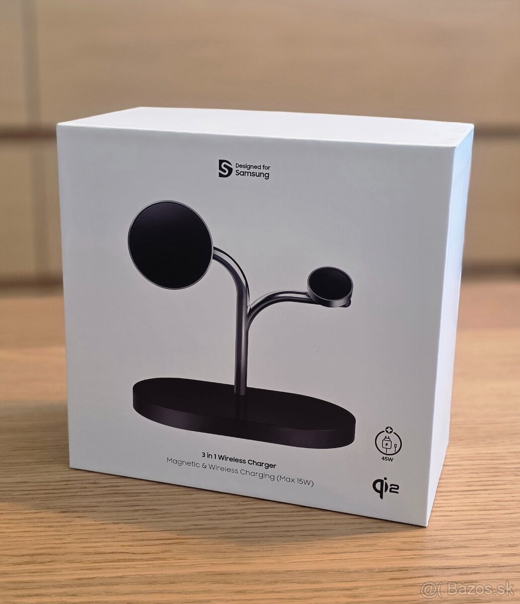 Predám úplne novú originálnu bezdrôtovú nabíjačku Samsung 3 v 1, zakúpenú na Samsung.sk. Je špeciálne navrhnutá pre Samsung, môžete s ňou súčasne nabíjať telefón, Galaxy Watch a Galaxy Buds alebo Galaxy Ring.