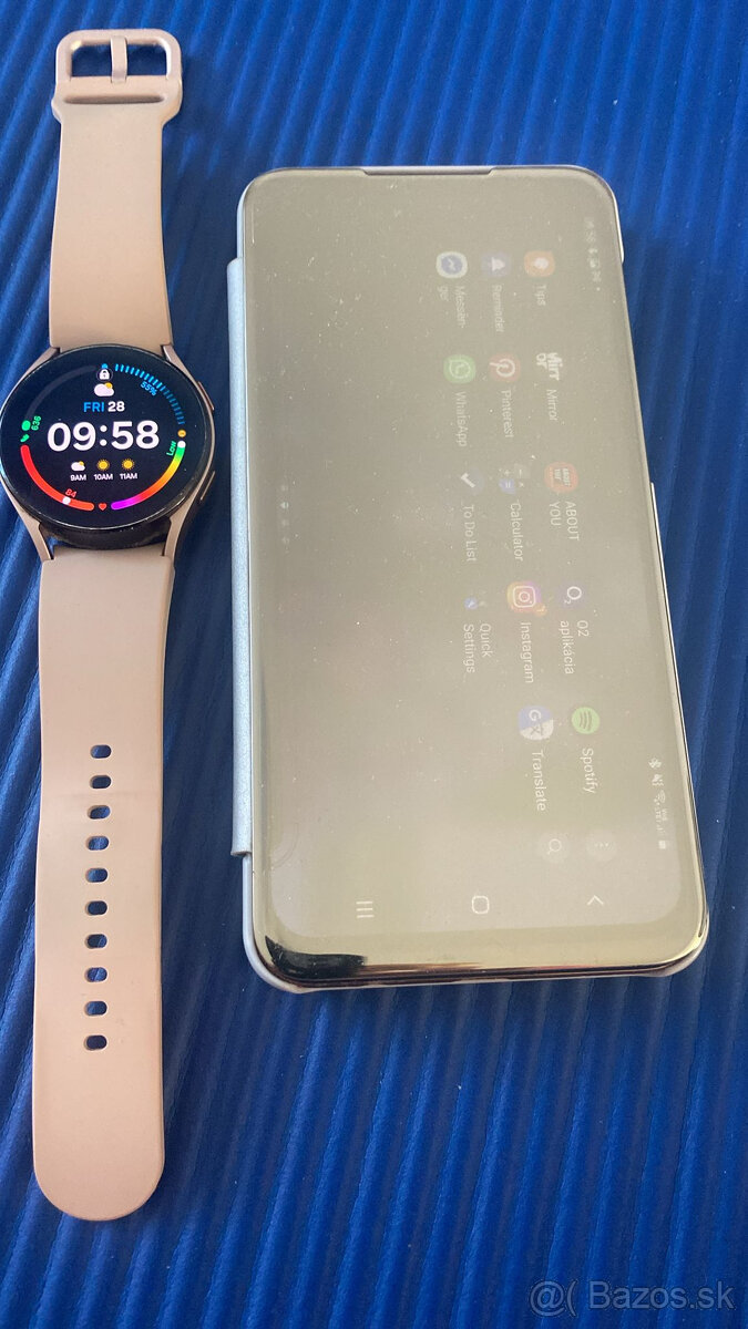 K telefónu pridávam smart hodinky Samsung Galaxy Watch 4 (SM-R860) - plne kompatibilné, ideálne na fitness, notifikácie a bežné denné používanie, merajú všetky fitness parametre ako sú tep, kroky, spálenú energiu, srdcový tlak atď. Hodinky taktiež plne funkčné, v dobrom stave, majú ružový remienok.