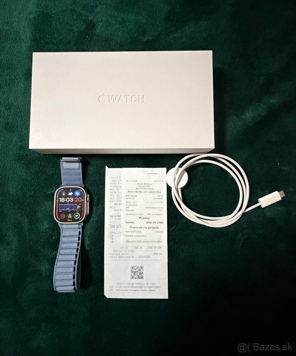 Pozdravujem predám hodinky APPLE WATCH ULTRA 3 vo farbe prírodný titán. Kupované 30.11.2025 v kamennej predajni istyle bory mall. Kupované na fyzickú osobu takže záruka 2 roky do 30.11.2027. 100% zdravie batérie bez škrabancov. Komplet nabíjací kábel, doklad o kúpe ako ak krabička. Dôvod predaja ostávam pri Garmine.