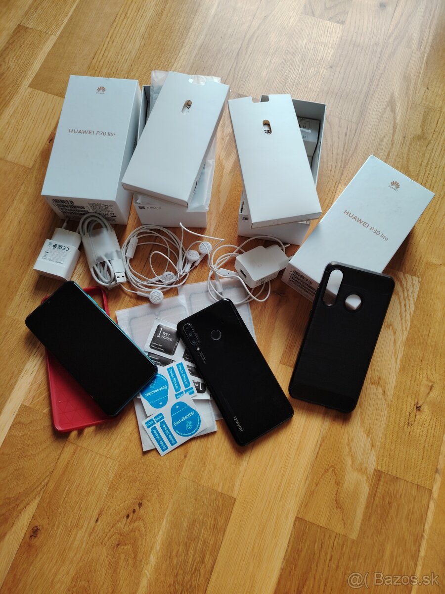 Predam 2ks mt Huawei P30 lite s komplet original prislusenstvom. Rychlonabijacky, sluchadla s 3,5mm jack, kryty v cervenej a ciernej farbe, 2ks tvrdenych skiel na displej aj fotoaparat.