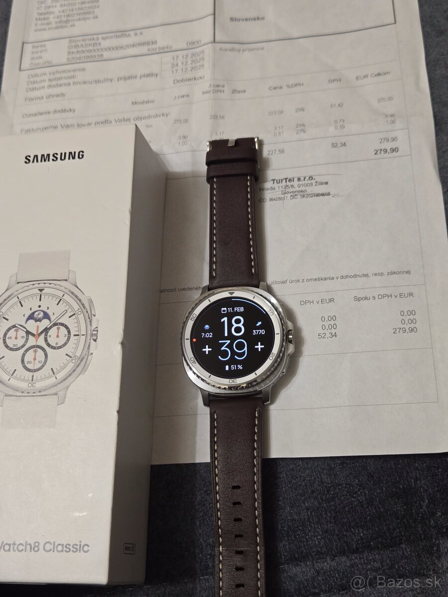 predám Samsung Galaxy Watch8 Classic White. K dispozícii originál krabička, kábel, náramok hnedý kožený. Boli len vyskúšané, v záruke 22 a pol mesiaca.