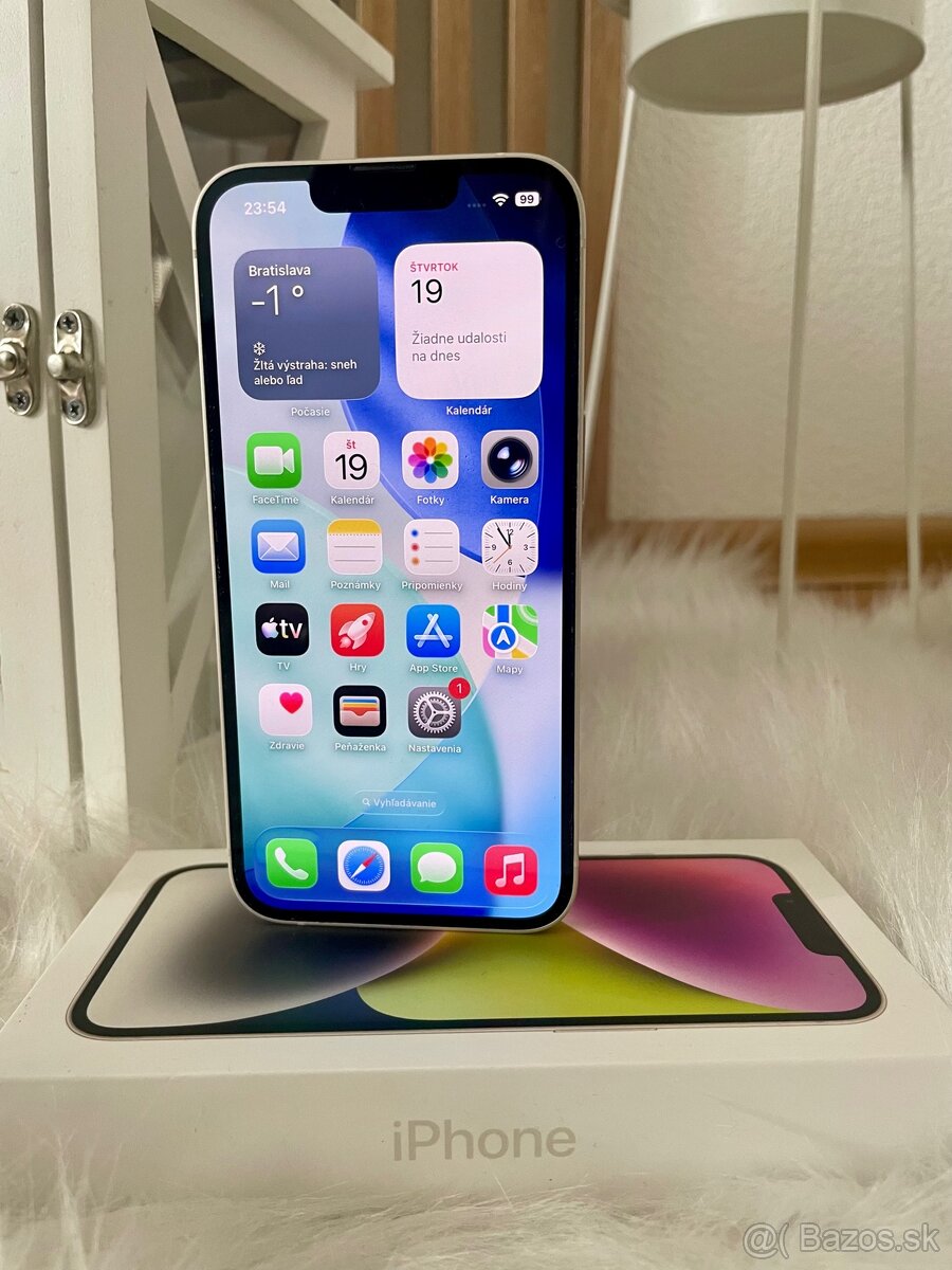 Predám iPhone 14, 128GB v bielej farbe. Telefón je bez škrabancov a odierkov. TOP stav. Všetko funguje na 100% (face ID, kamery, atď.) Telefón nebol opravovaný. Pôvodná batéria má 85% stav.