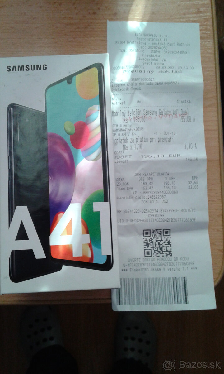 Predám Samsung Galaxy A 41 kupovaný 8.3.2021 v Nitre (Priložím doklad o kúpe) po celý čas používania bol v púzdre,top stav.Originál balenie.Osobný odber,neposielam.