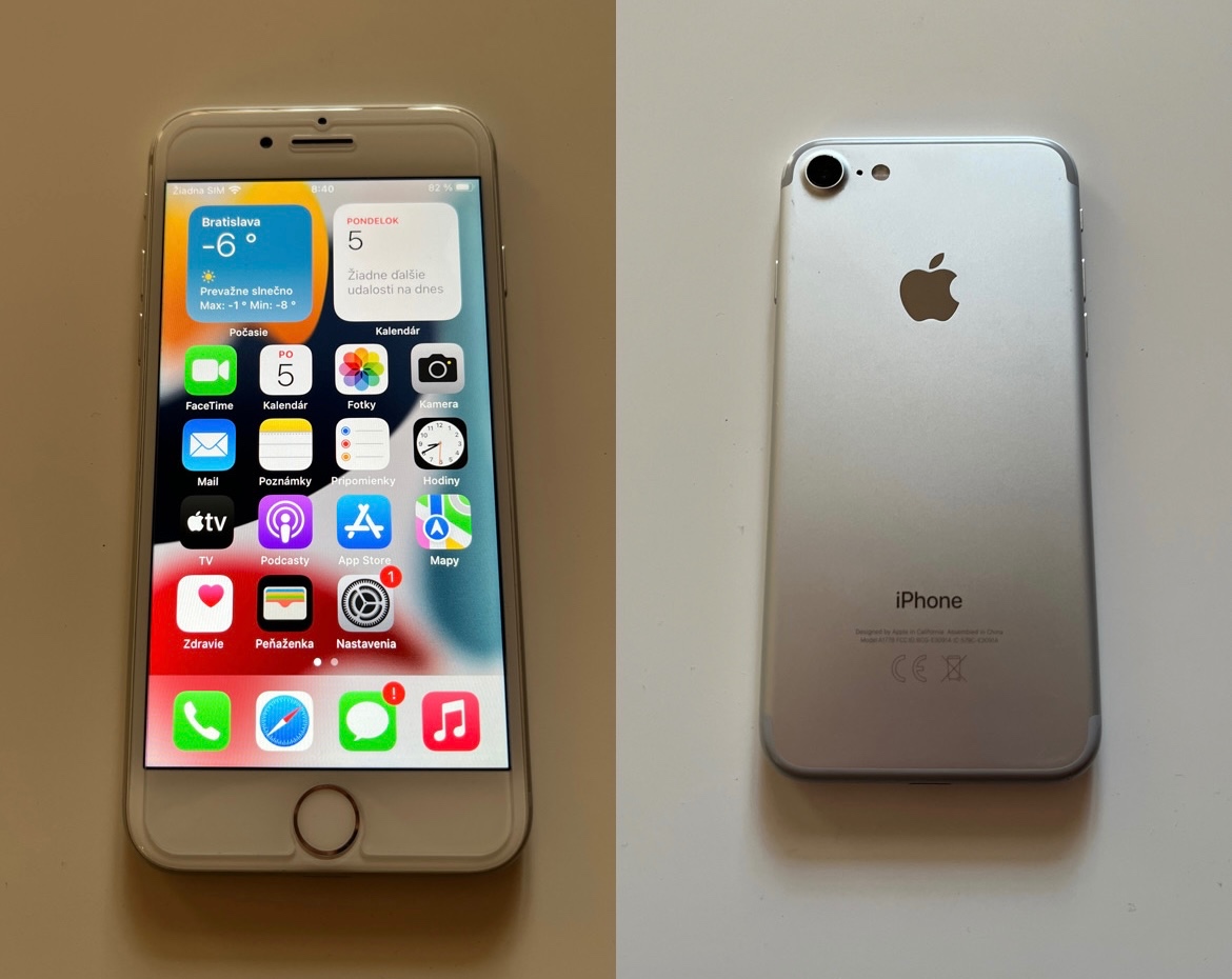 Predám iPhone 7 v striebornej farbe a vo výbornom stave. Telefón bol nosený vždy v ochrannom obale a s nalepeným sklom, takže je v perfektnom stave, bez známok používania. Nebol nikdy opravovaný ani otváraný, všetko funguje (Touch ID, automatický jas). Dôvod predaja je prechod na novší model.