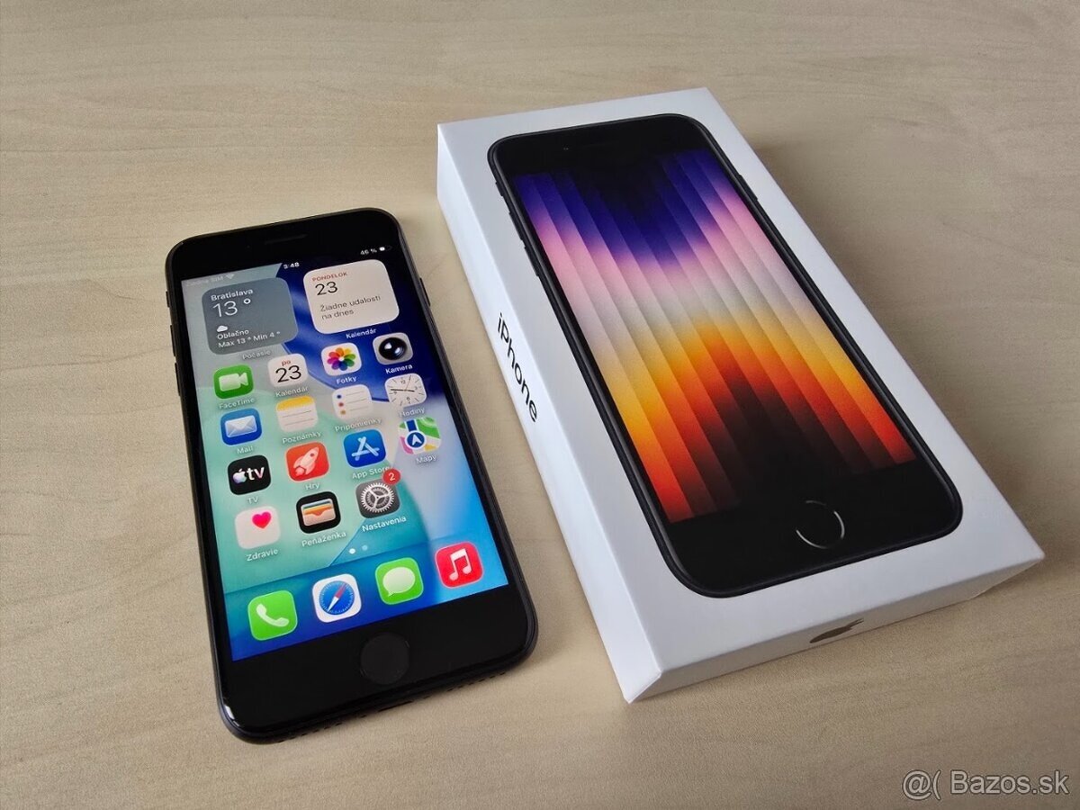Predám Apple iPhone SE 2022 64GB v čiernej farbe. Telefón bol používaný minimálne (zapínaný raz mesačne ako pohotovostný) a nemá v podstate žiadne známky používania. Batéria 100%. Už mimo záruky.