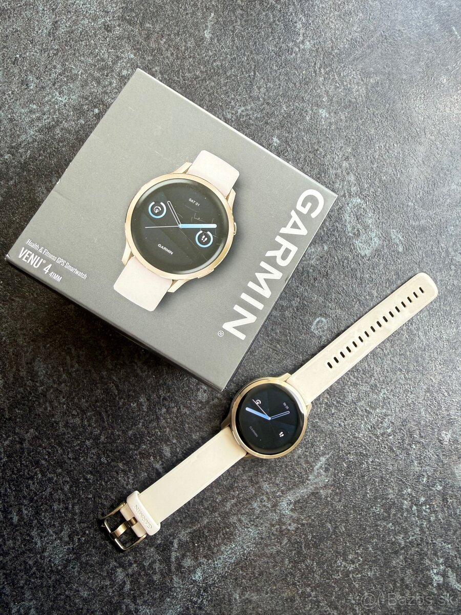 Predám používané hodinky Garmin venu 4 41mm v zlatej farbe/french gray. Hodinky sú v dobrom stave bez poškodení, majú len drobnú odreninu v spodnej časti (viď foto). Celý čas boli používané s ochrannou fóliou.